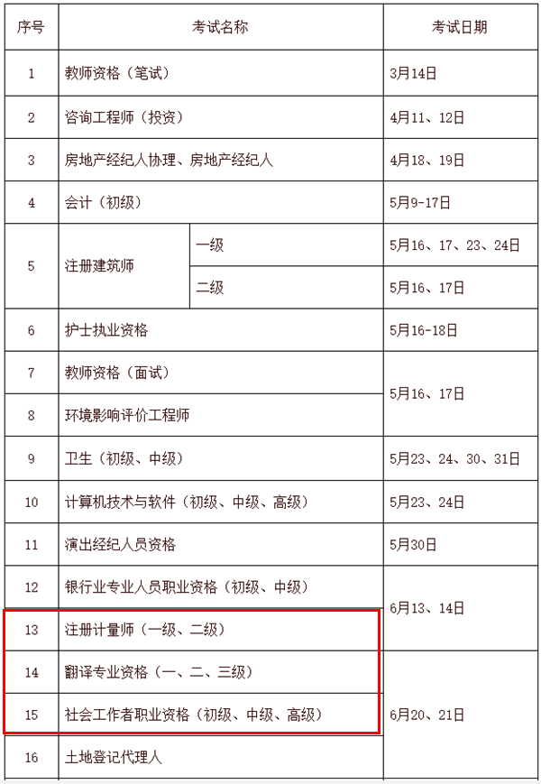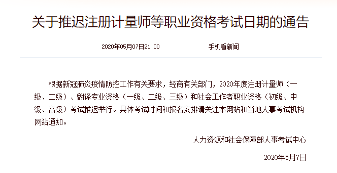根据新冠肺炎疫情防控工作有关要求,经商有关部门,2020年度注册计量师(一级、二级)、翻译专业资格(一级、二级、三级)和社会工作者职业资格(初级、中级、高级)考试推迟举行。具体考试时间和报名安排请关注本网站和当地人事考试机构网站通知。
