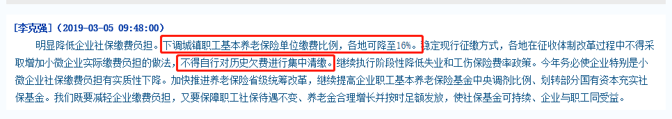 两会上,总理宣布了,将下调城镇职工基本养老保险单位缴费比例,各地可降至16%!不得自行对历史欠费进行集中清缴!