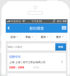 海量工作机会等着您,同一时刻您将面对数以十万的工作机会;帮助您记忆最近搜索条件,简化您的搜索操作。